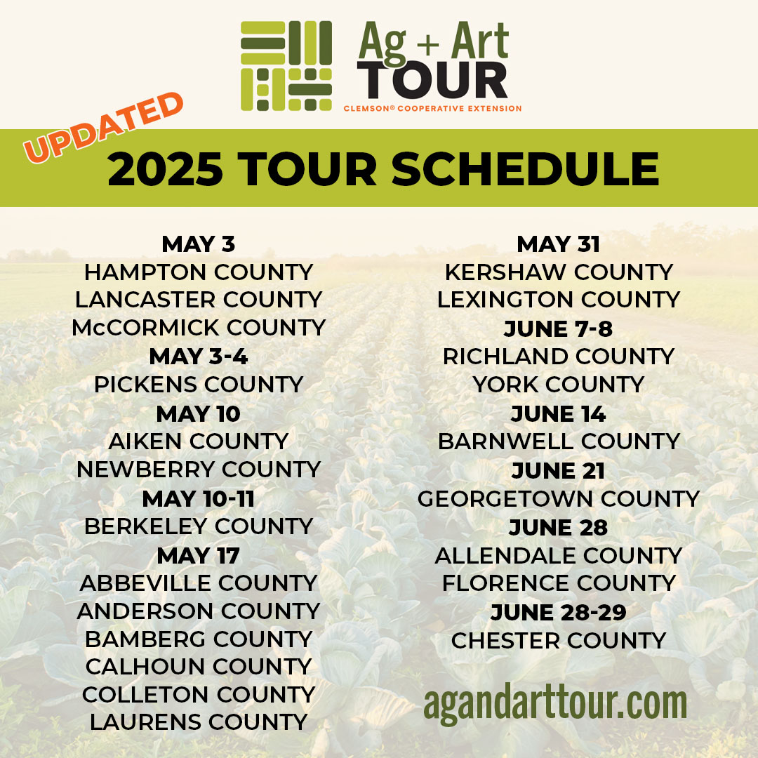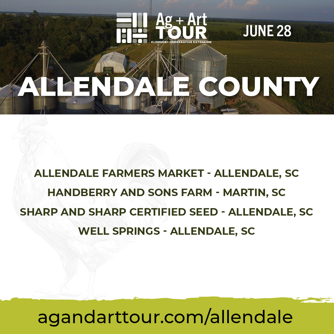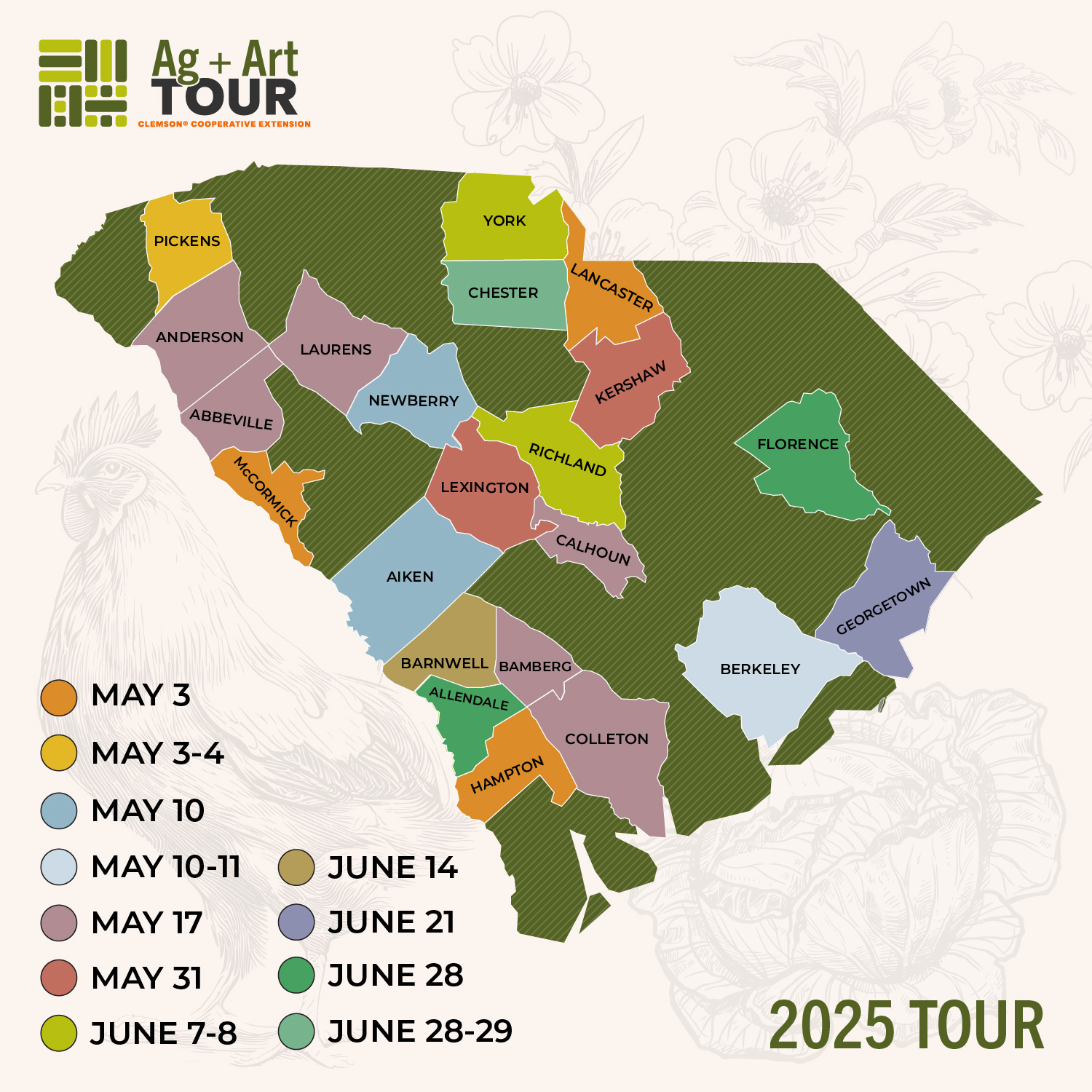 The South Carolina Ag + Art Tour is a free, self-guided tour of farms and markets that feature local artisans at every stop! During the tour, visitors have the opportunity to see first-hand where their food comes from, watch artists in action and purchase their works, enjoy the melodies of local musicians, and learn more about rural life. The tour is the largest free farm and art tour in the nation with over 150,000 visitors participating since 2012.